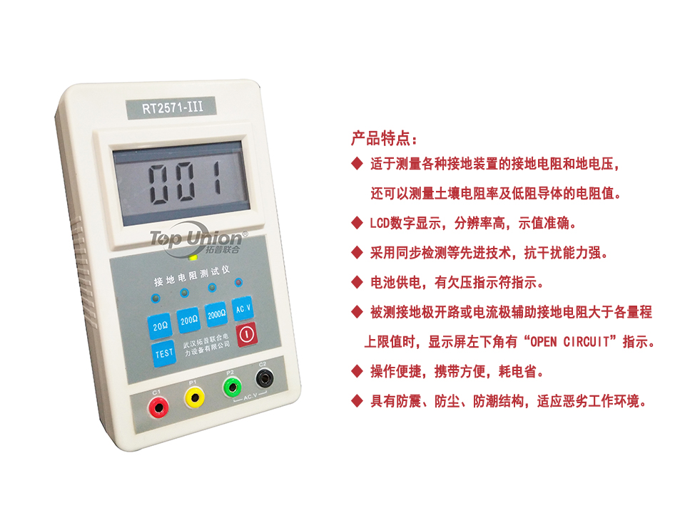 此次推出的RT2571-III接地電阻測試儀,體積更小、重量更輕、操作便捷,攜帶方便,采用同步檢測等先進技術,適于測量各種接地裝置的接地電阻和地電壓,及土壤電阻率、低阻導體的電阻值。